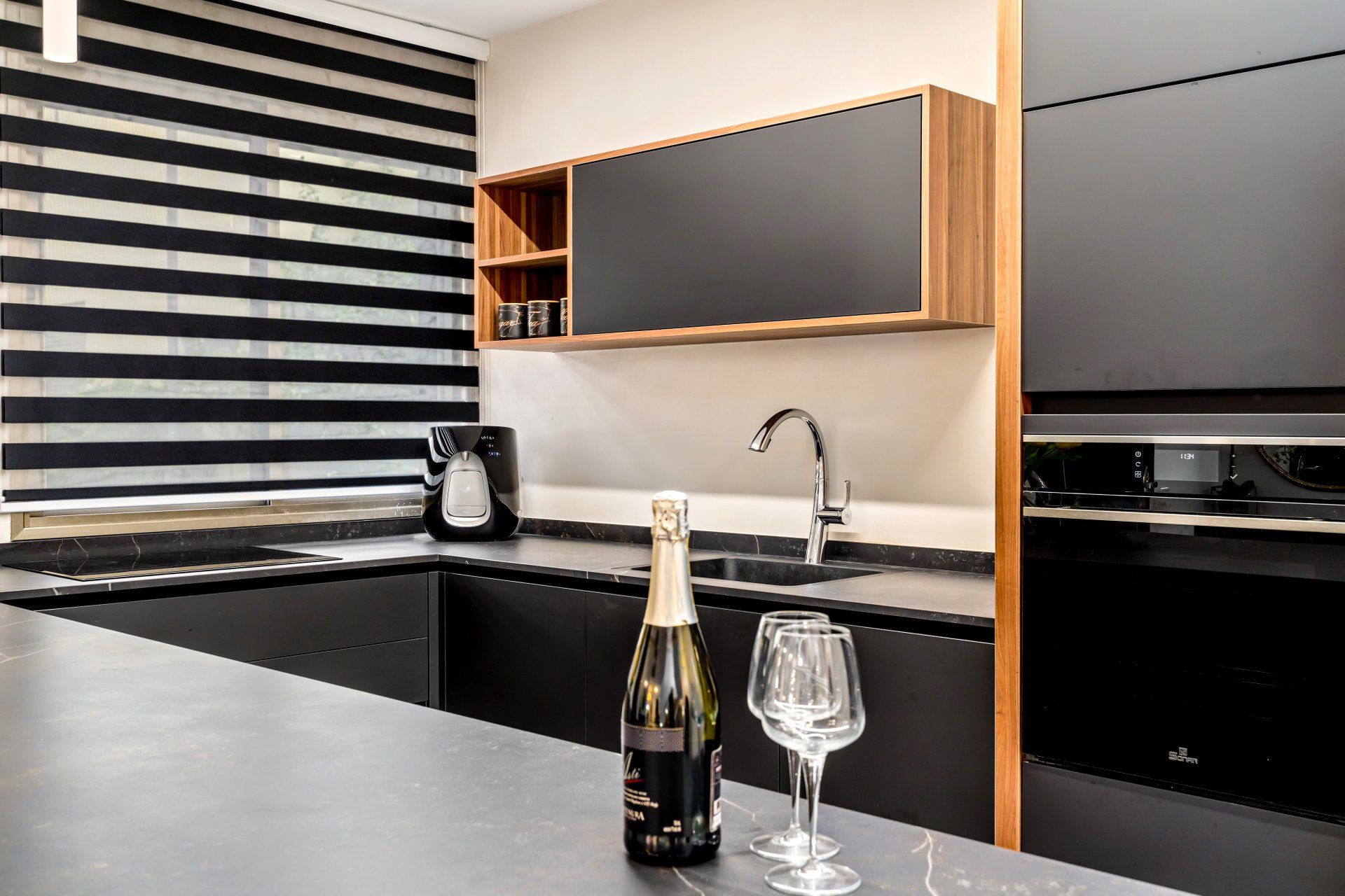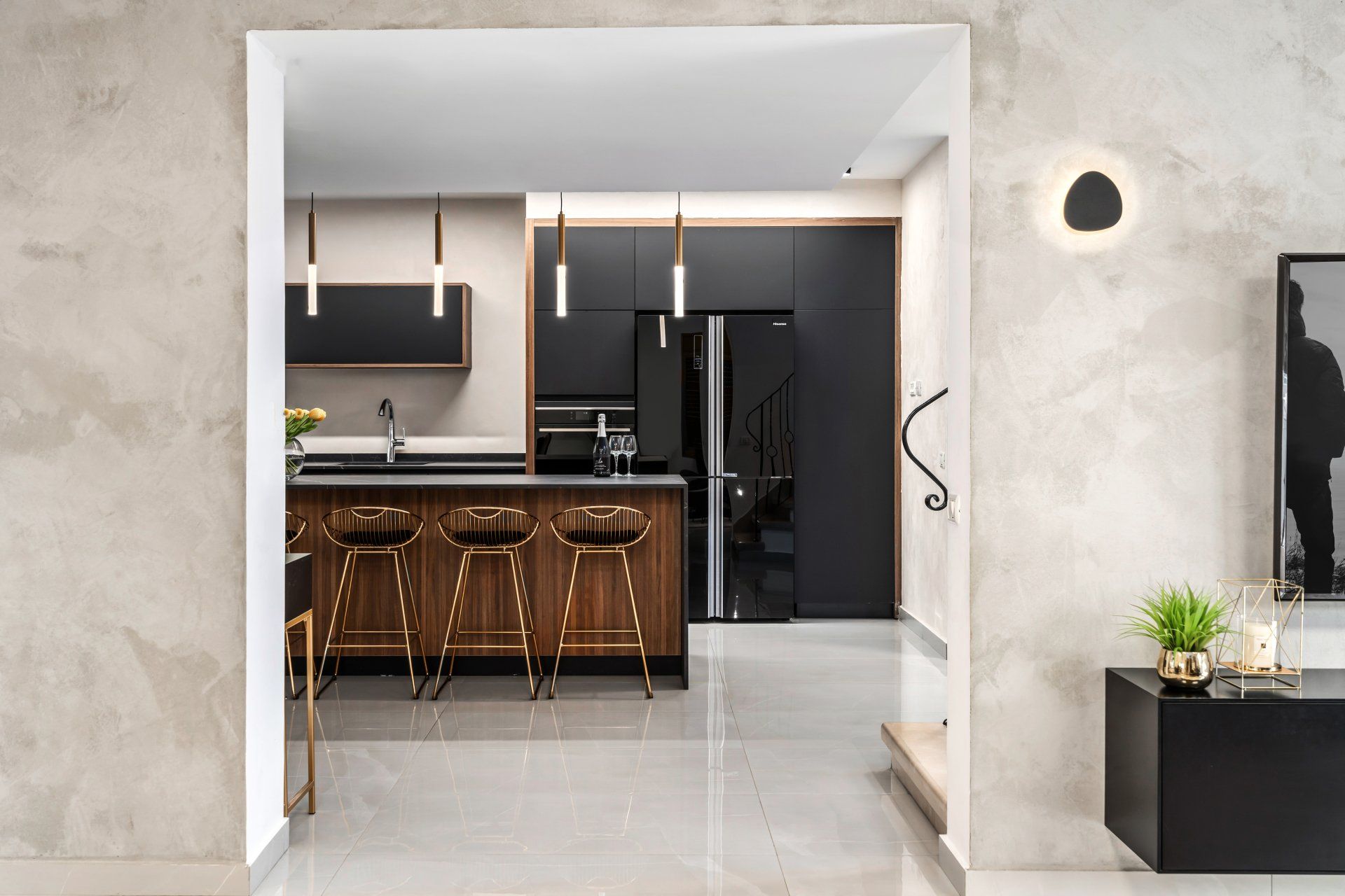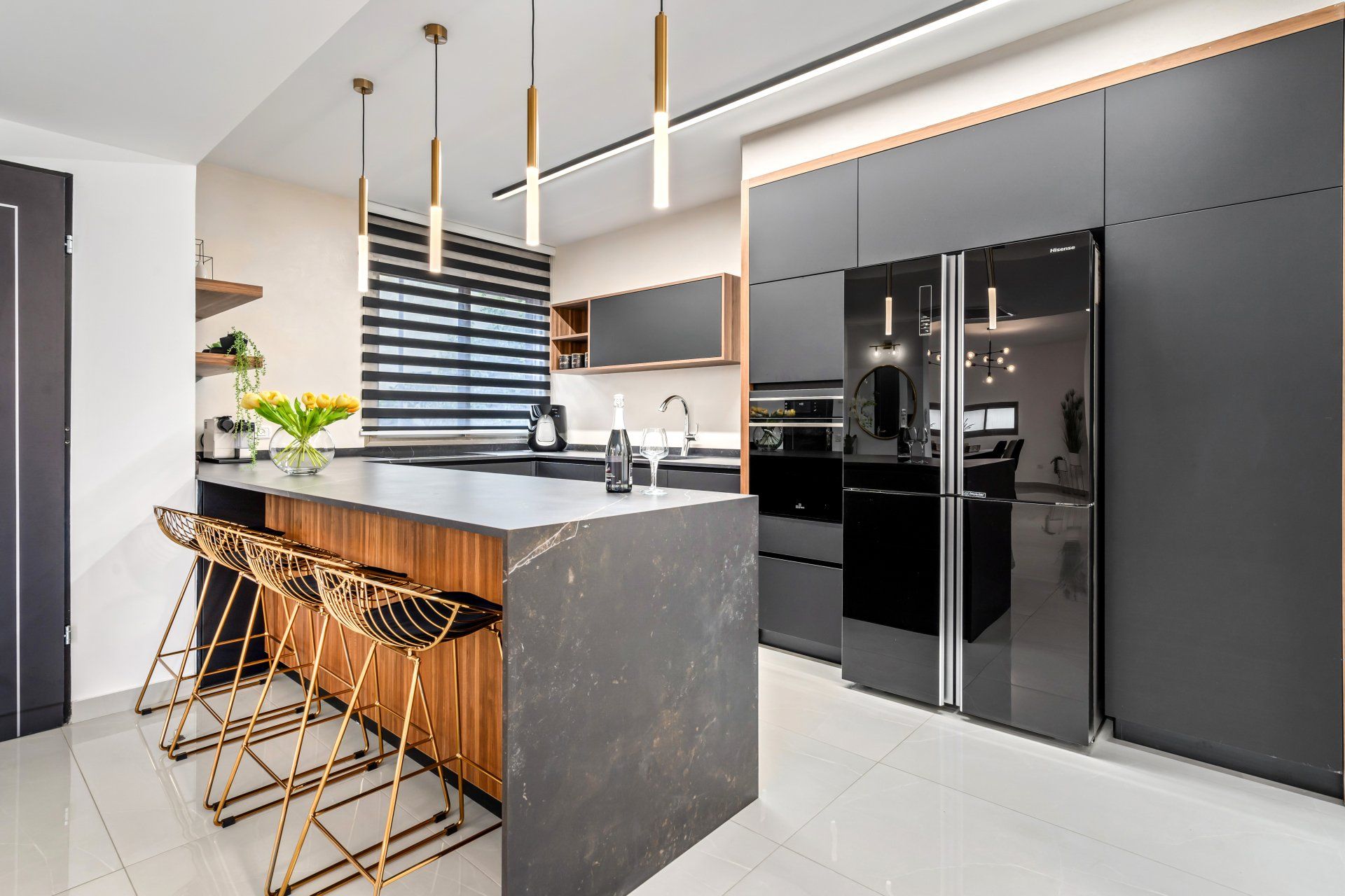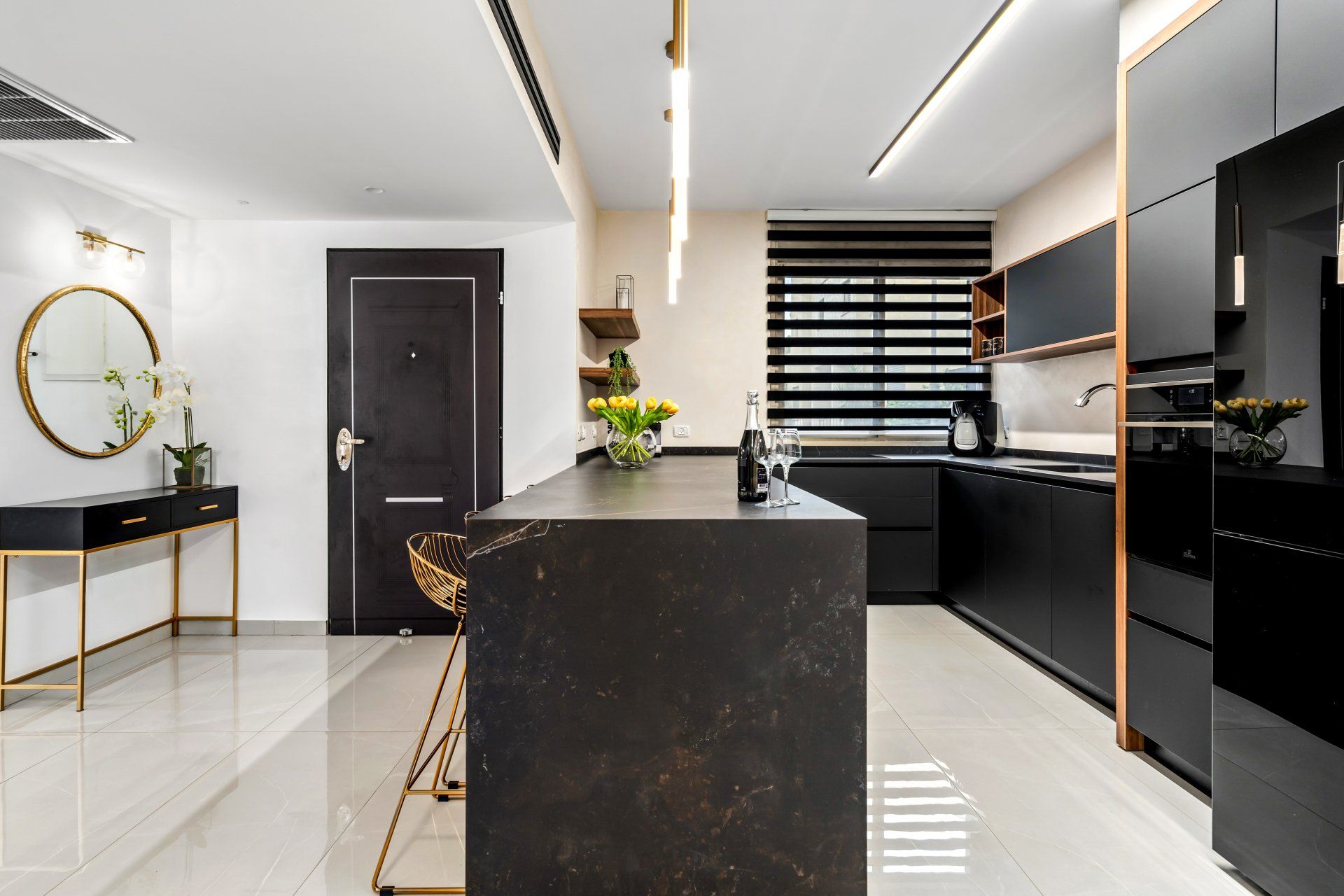 את רצונם של בני הזוג לשמור על קו נקי ומודרני שילבתי לתוך בחירת החומרים הצבעים והגוונים, כמו גם הנגרות המותאמת אישית שתוכננה בקפידה בחללי הבית השונים.