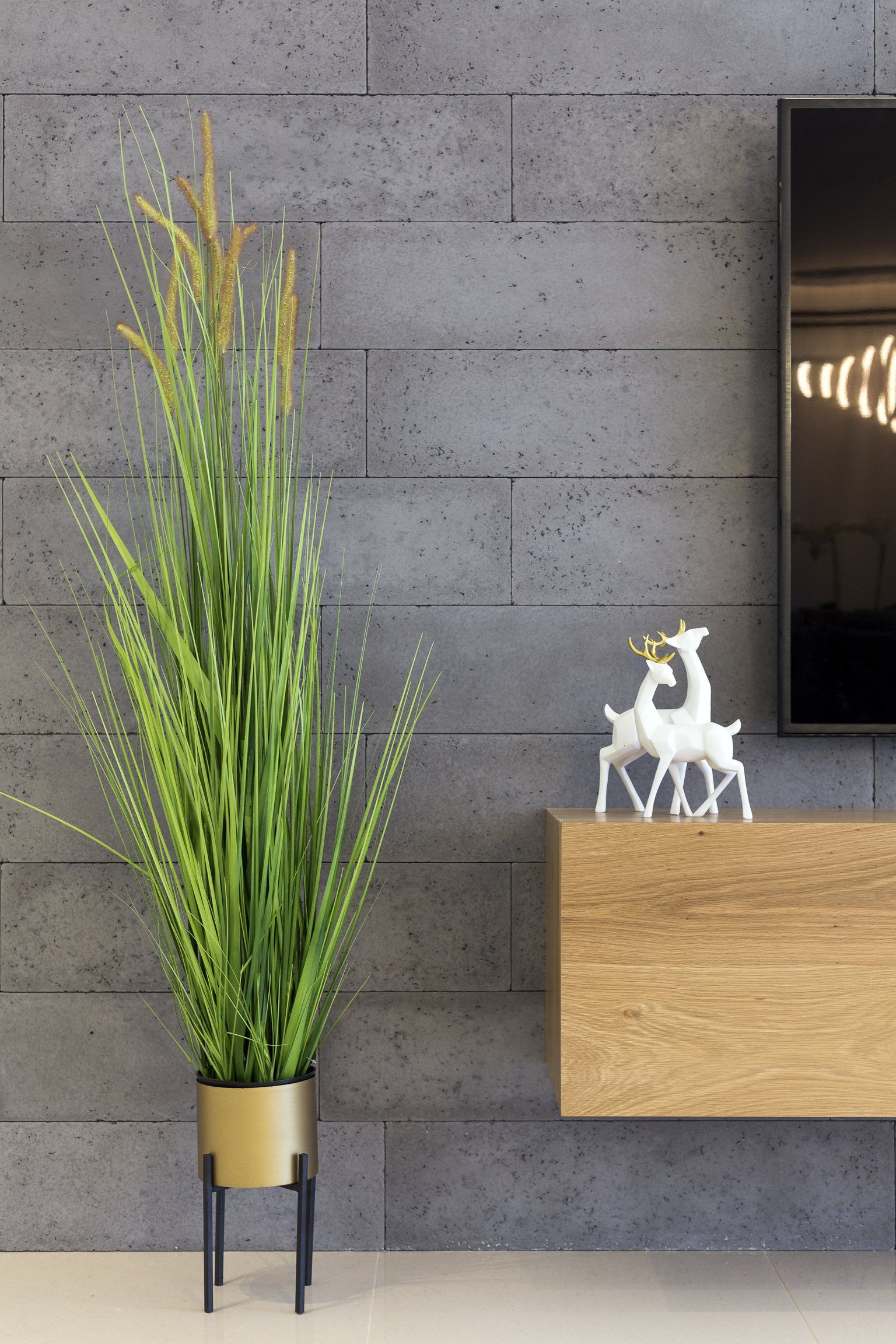 הקיר המרכזי – נקודת הפוקוס של חלל המגורים – חופה באריחי בטון עם תאורה נסתרת מובנית היוצרת רכות חמימה בחלל שצבעי הבסיס שלו קרים יחסית.