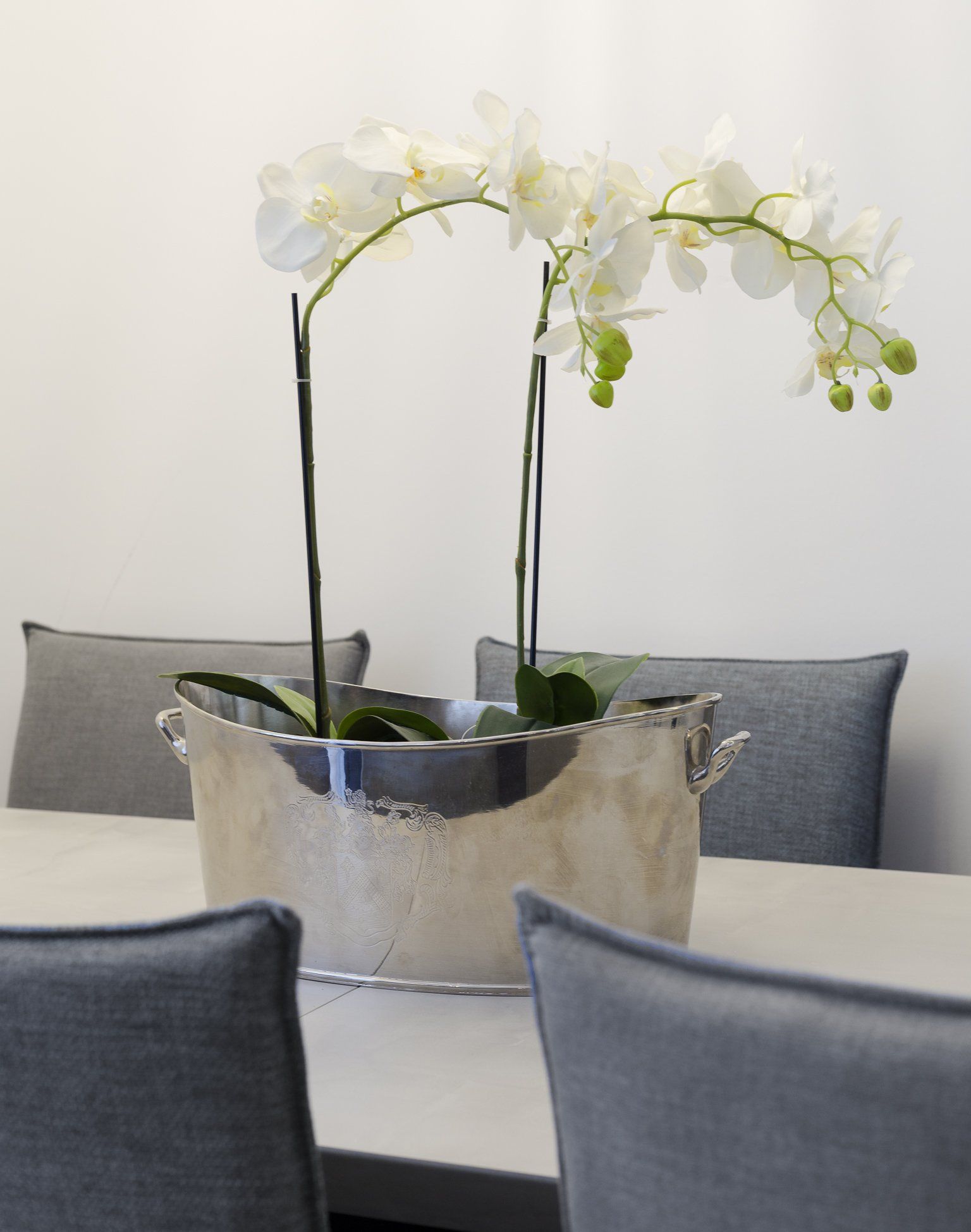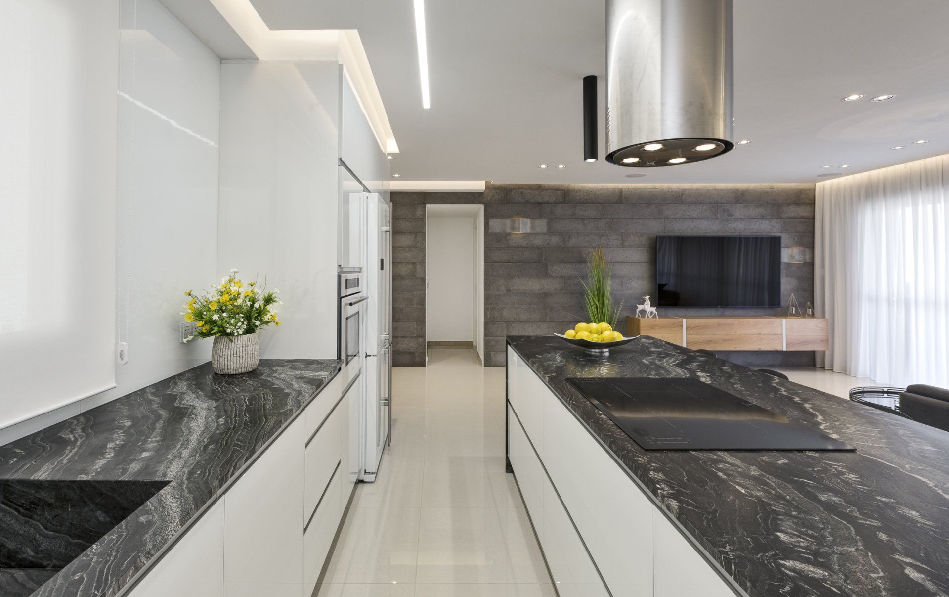 במרכז המטבח תוכנן אי מרווח לעבודה וישיבה וכן מקומות אחסון רבים בשתי יחידות של מזווה פונקציונאלי. משטח העבודה שנבחר יוצר קונטרסט עם צבעי הארונות ומחדד אותם.