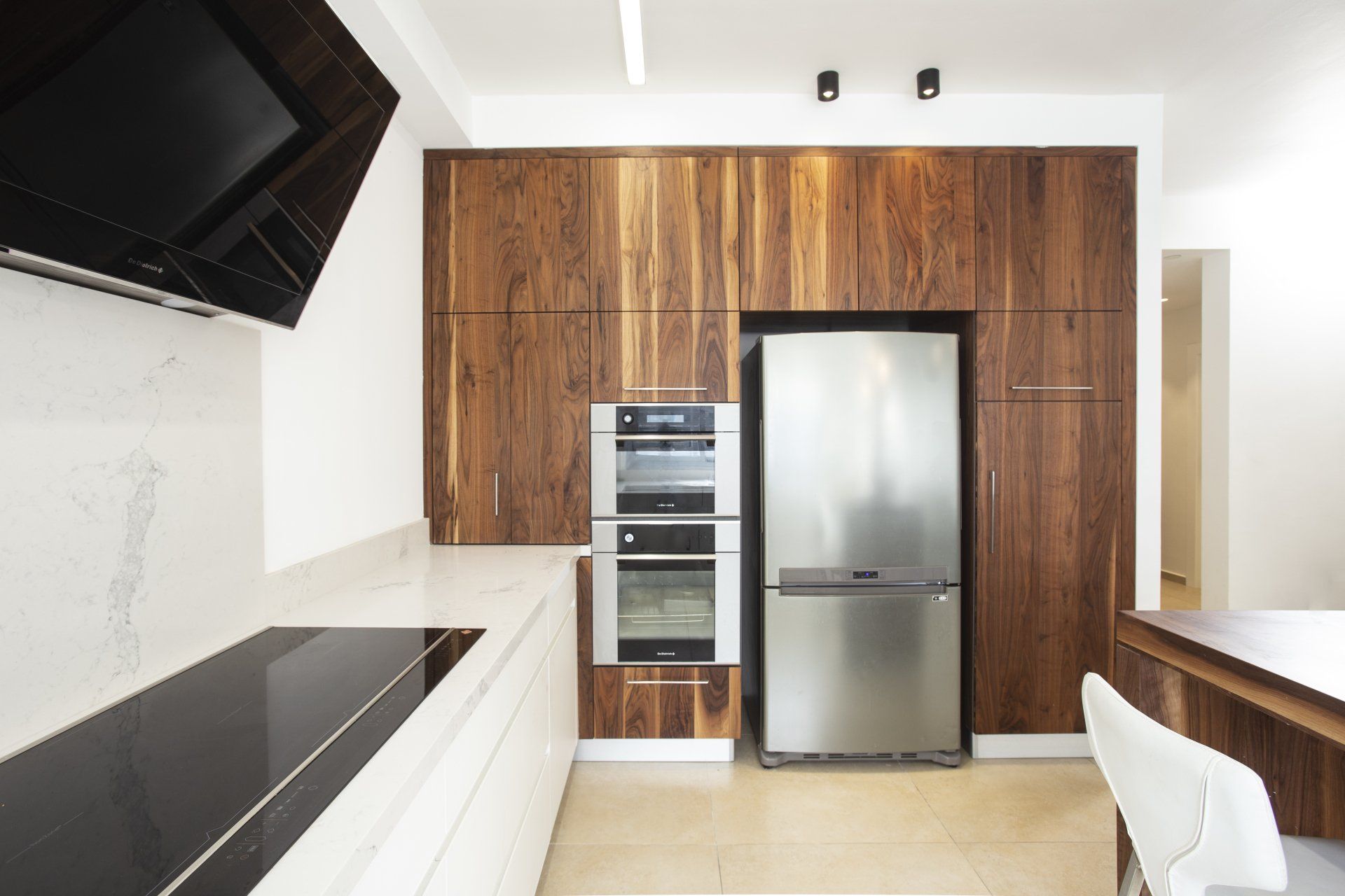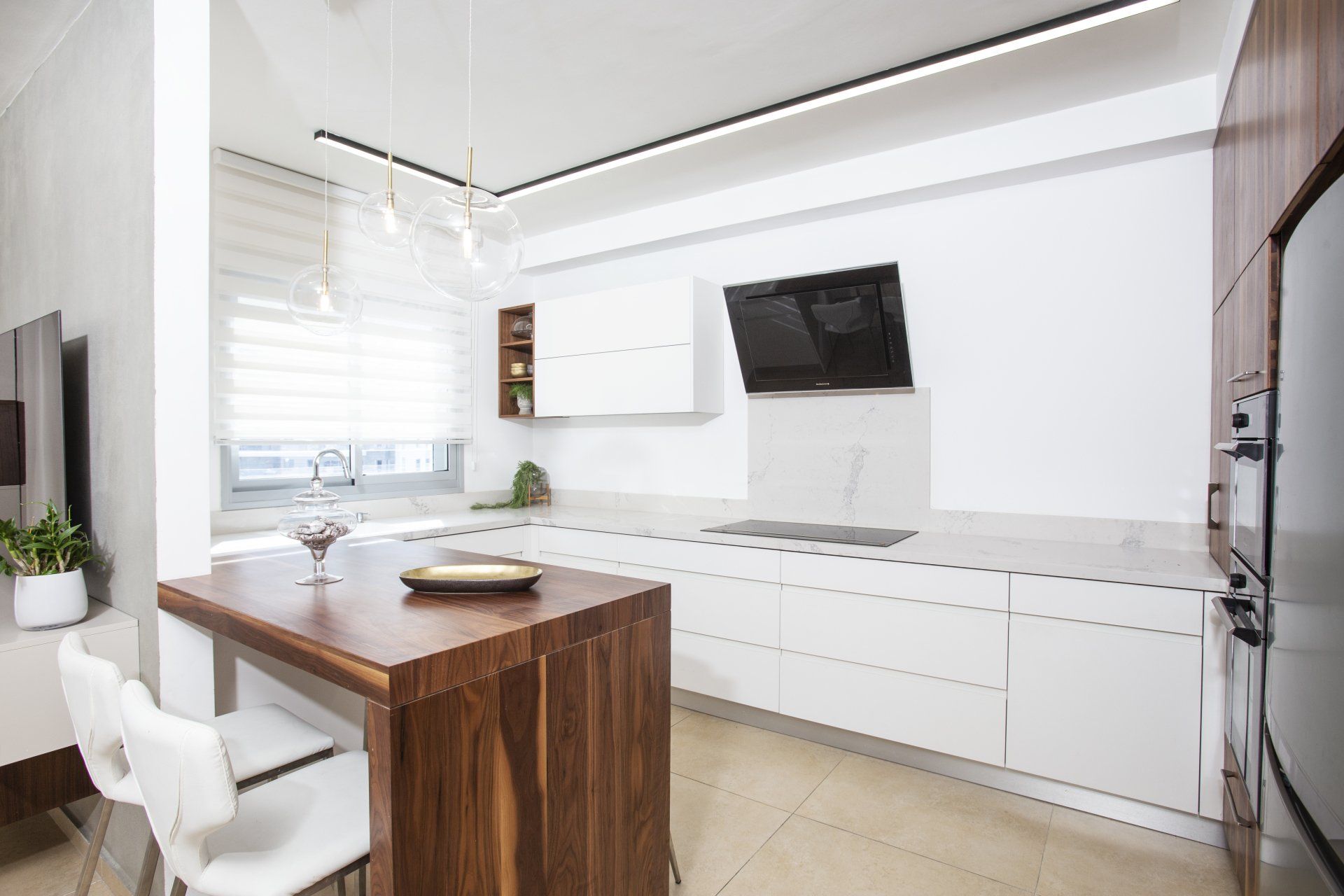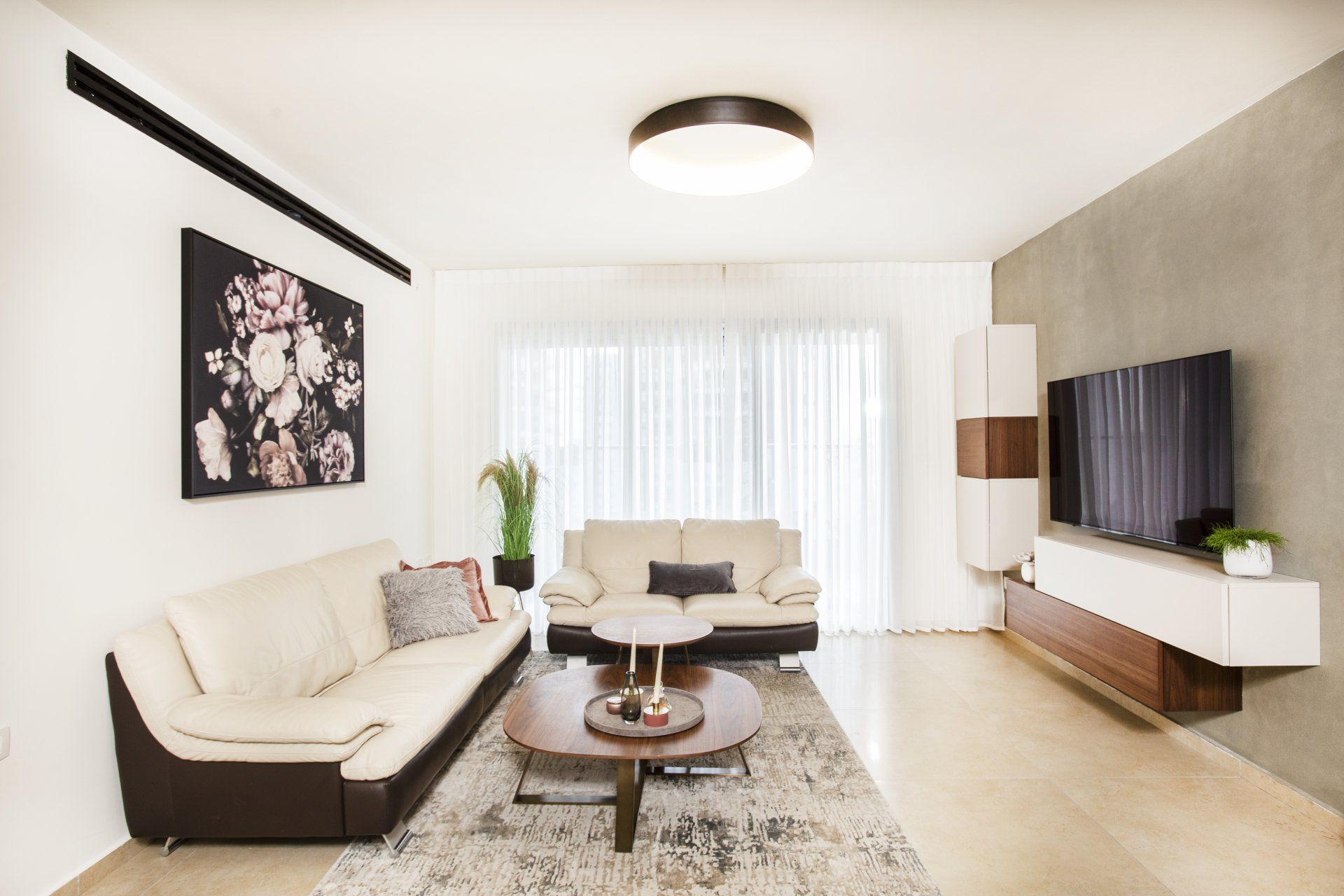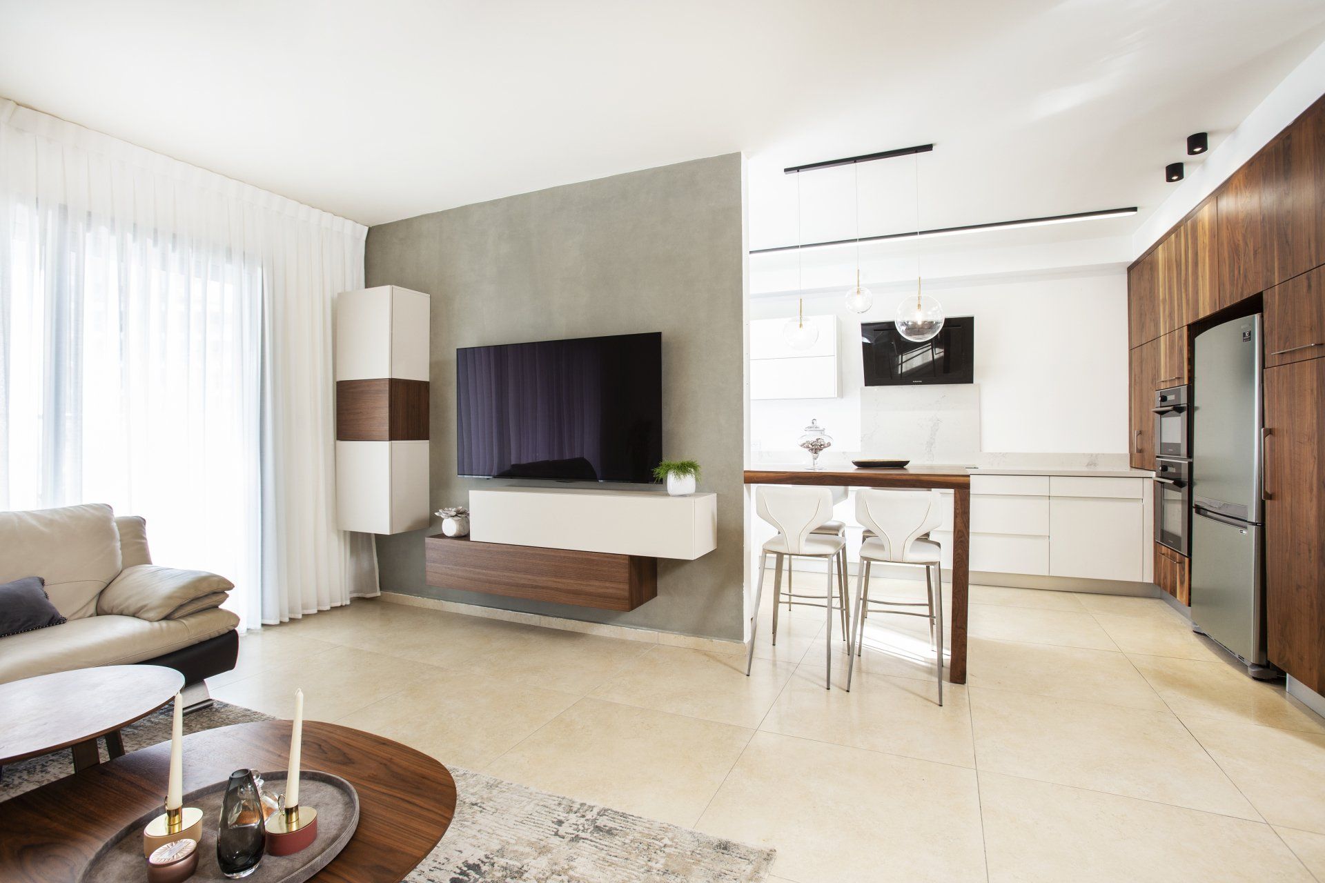 לרצונם של הזוג בבית מודרני וחמים ניתן מענה דרך בחירת חומרים טבעיים של עץ בארונות המטבח ופרקטים בחדרים. כלל הריהוט והתאורה שנבחרה יוצרים אווירה שקטה ומרשימה לצד עיטוף ורוגע. הגוונים הרכים של השמנת והלבן בריהוט ובטקסטיל משלימים את המראה המוקפד.